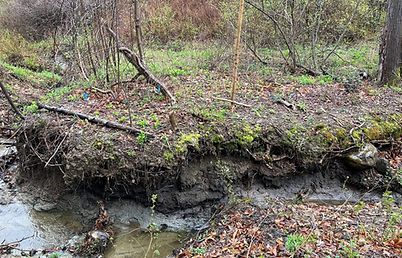 In 2023, our trail team noticed a crack forming down the center of the blue trail near the bridge just south of Gilman Road. What looked like a small issue has now become a serious threat. Over the last year, the streambank below the trail has eroded dramatically—carving out a 10-foot stretch of trail edge with a sudden 1—3-foot drop. The unstable soils are continuing to slump into the stream, and the bank is now compromised and may be too unstable to support the trail in a matter of 6 to 12 months.
